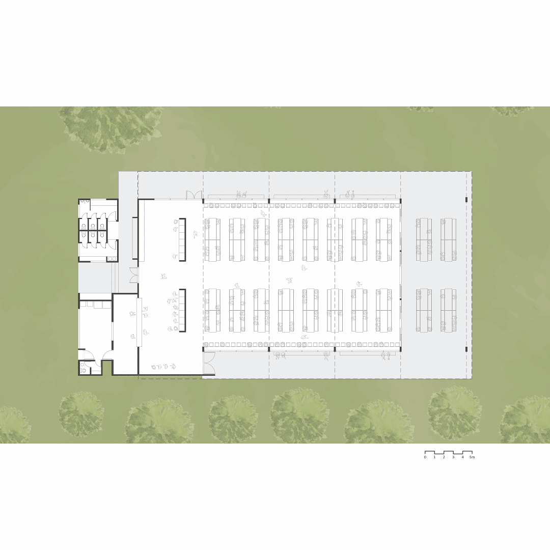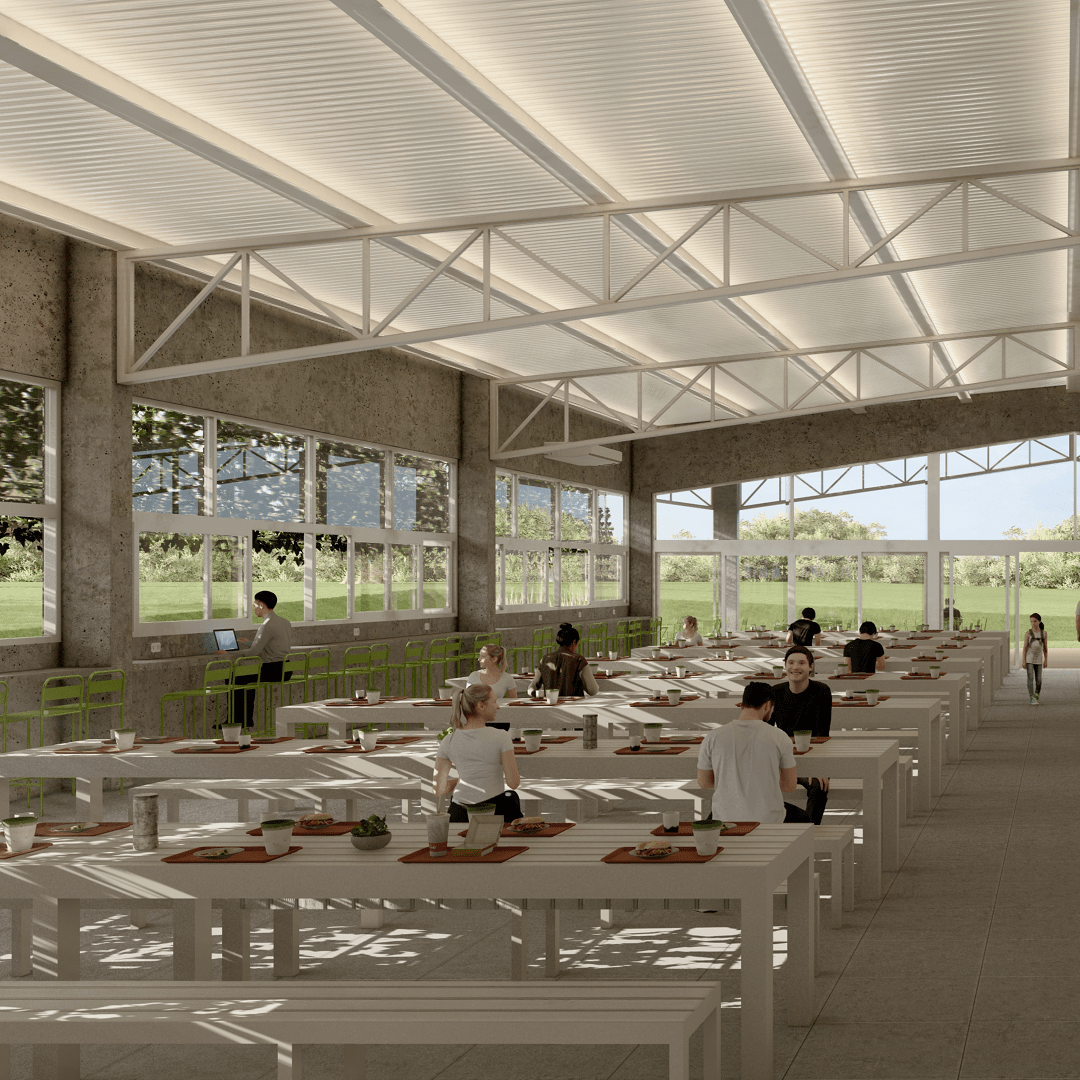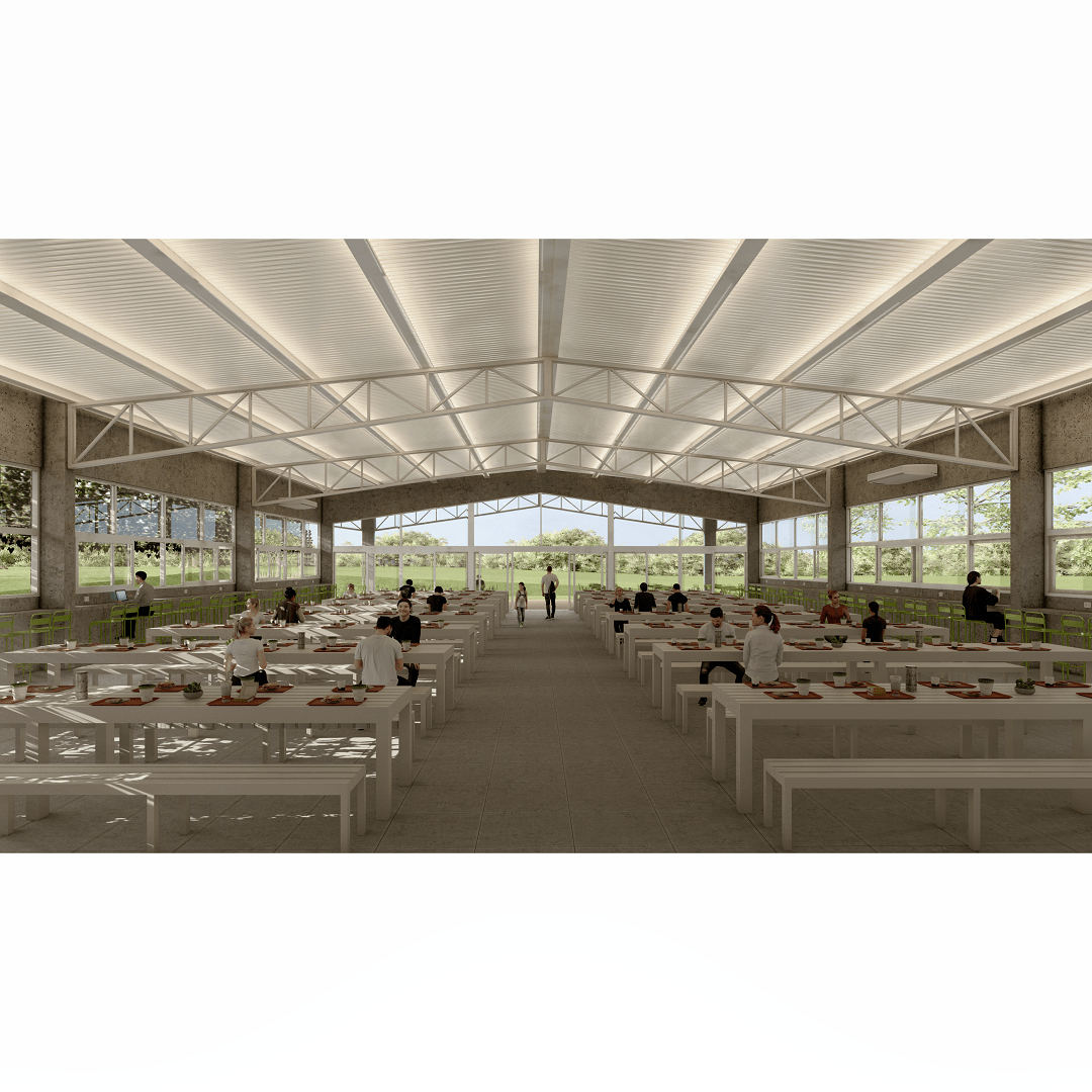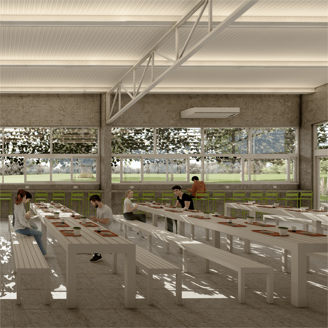 A mediados de diciembre comenzó el trabajo en el comedor propiamente dicho, obra que está muy avanzada y en pocos meses será una realidad. Con un total de 852 m2, el comedor contará con 525 m2 cubiertos y 327 m2 semi cubiertos en una amplia galería que rodeará toda la edificación. Dispondrá de una capacidad máxima de 385 personas sentadas almorzando o trabajando en su interior. Además, el objetivo es que este espacio pueda ser aprovechado como SUM para eventos y reuniones donde podrán caber más de 400 personas. Tal y como se muestra en las imágenes que compartimos, se trata de una construcción amplia, luminosa y ventilada que busca compenetrarse con la maravillosa naturaleza circundante generando un espacio agradable y sereno.