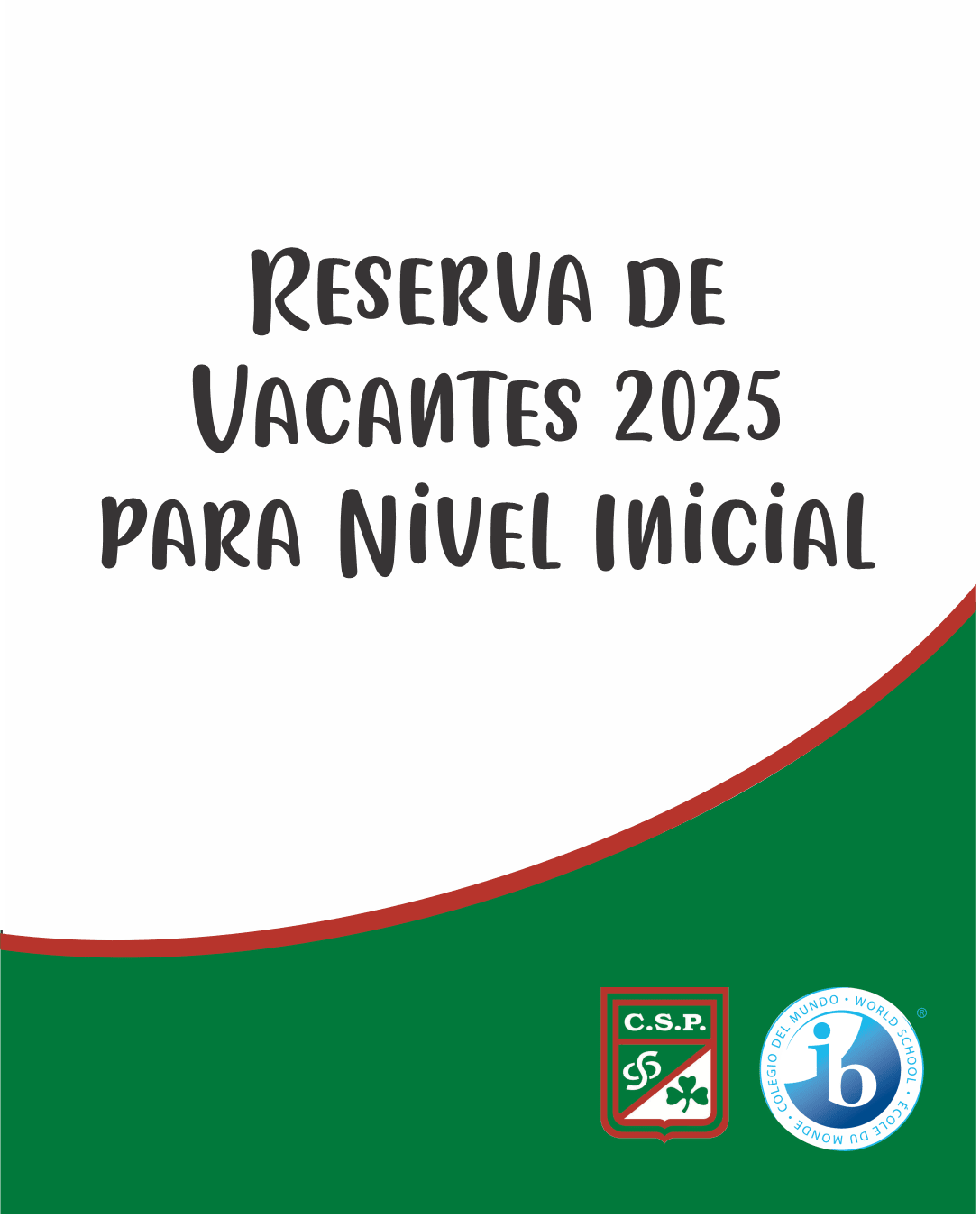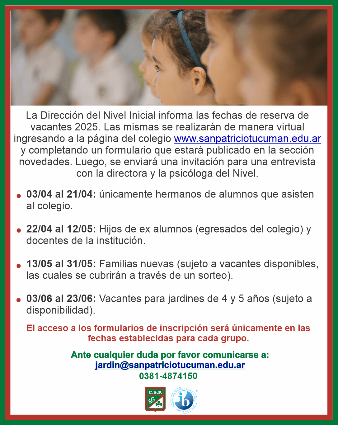 La Dirección del Nivel Inicial informa las fechas de reserva de vacantes 2025. Las mismas se realizarán de manera virtual ingresando a la página del colegio www.sanpatriciotucuman.edu.ar y completando un formulario que estará publicado en la sección novedades. Luego, se enviará una invitación para una entrevista con la directora y la psicóloga del Nivel.