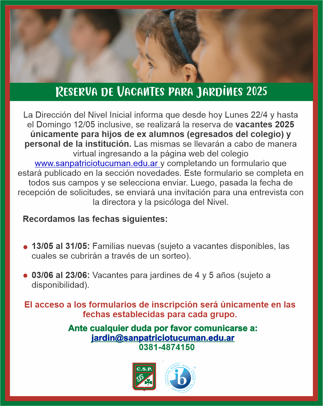Más adelante, finalizado el período de tiempo establecido para el envío de solicitudes, nos contactaremos con ustedes para acordar una entrevista con la Directora y Psicóloga del Nivel. Si tienen alguna inquietud, por favor no duden en comunicarse al teléfono 0381-4874150 o al mail jardin@sanpatriciotucuman.edu.ar ¡Muchas gracias por elegirnos para la educación de sus hijos!