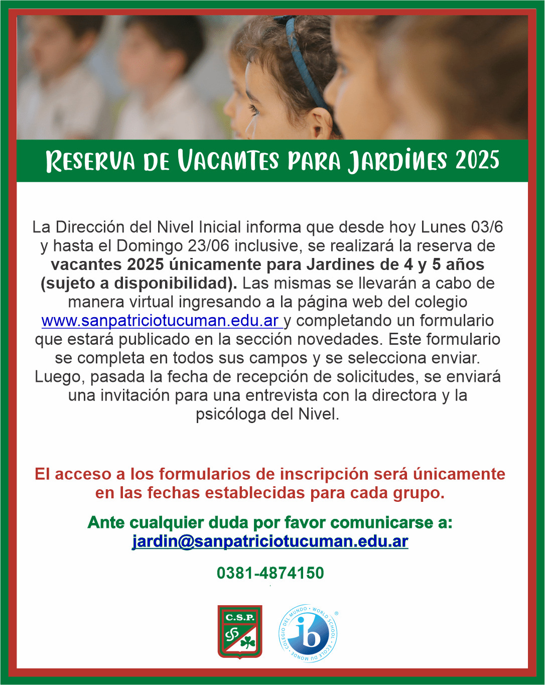 Más adelante, finalizado el período de tiempo establecido para el envío de solicitudes, nos contactaremos con ustedes para acordar una entrevista con la Directora y Psicóloga del Nivel. Si tienen alguna inquietud, por favor no duden en comunicarse al teléfono 0381-4874150 o al mail jardin@sanpatriciotucuman.edu.ar ¡Muchas gracias por elegirnos para la educación de sus hijos!