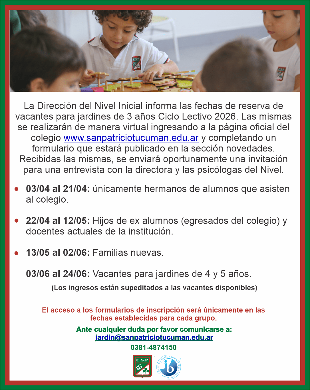 La dirección del Nivel inicial informa las fechas de reserva de vacantes para jardines de 3 años ciclo lectivo 2026. Las mismas se realizarán de manera virtual ingresando a la página oficial del colegio.