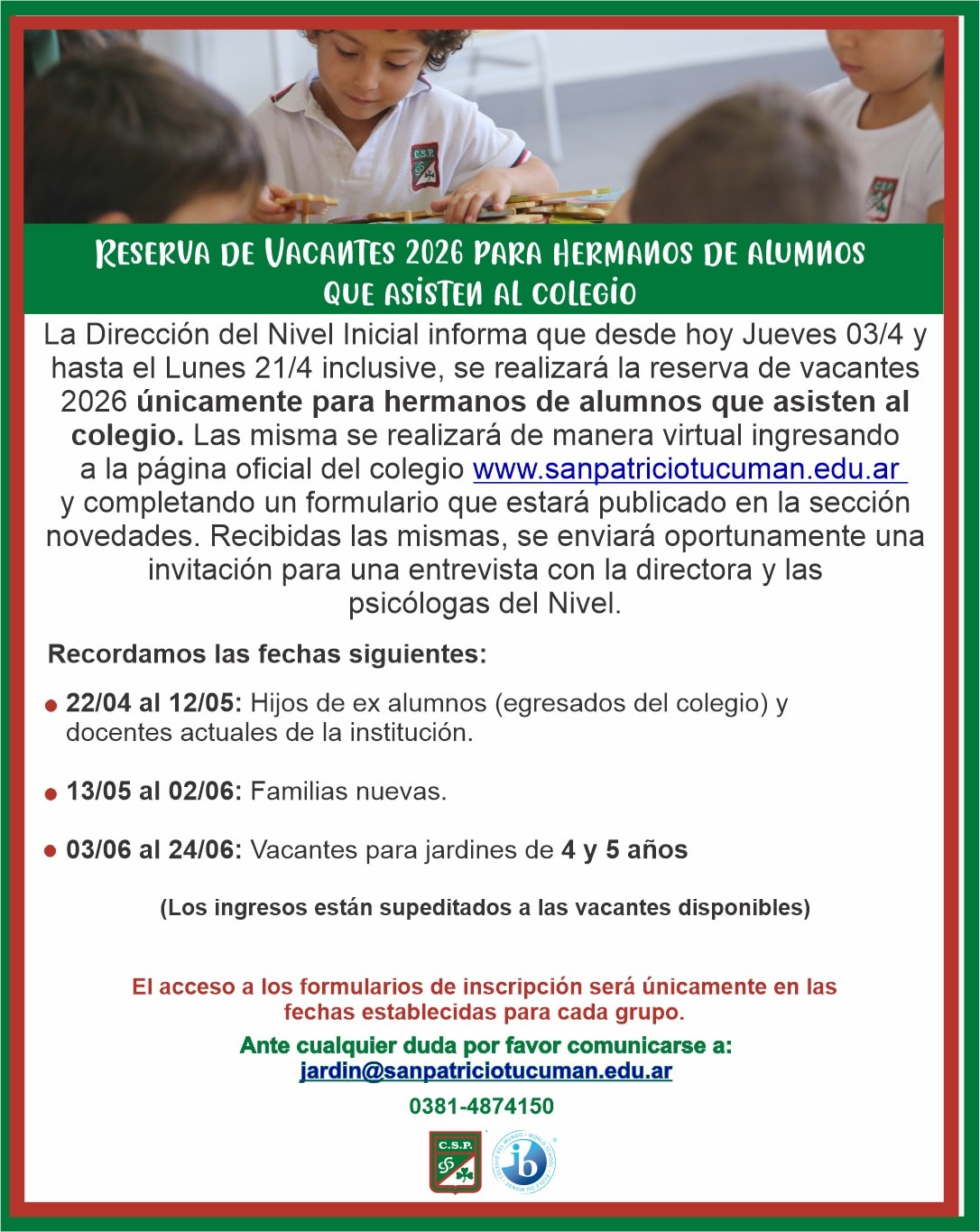 Desde el Jueves 3/4 y hasta el Lunes 21/4 inclusive, estaremos recibiendo solicitudes de vacantes 2026 para Jardines de 3 años para hermanos de alumnos que asisten al colegio.